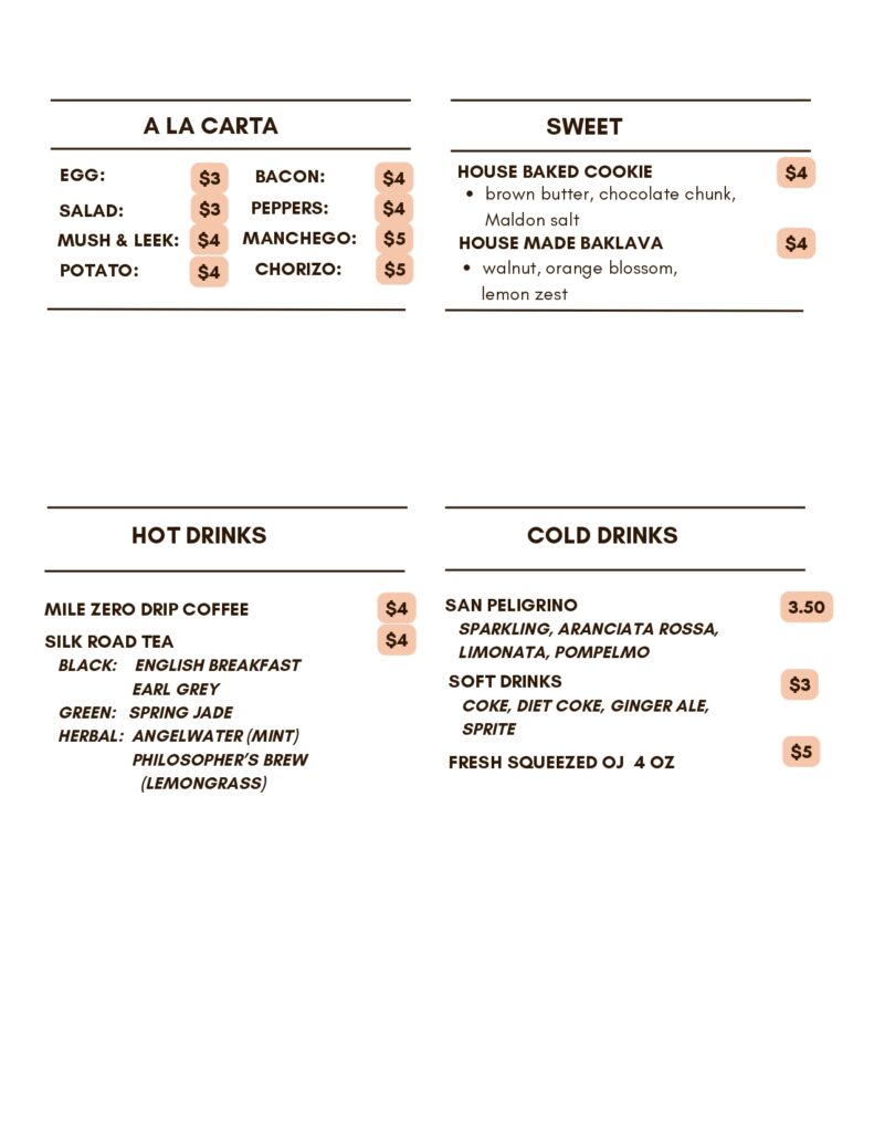 3 Eggs, House-made Potato Hash, Brava Sauce, Pan con Tomate, Bacon, Chorizo, Mushroom & Leek, Greens